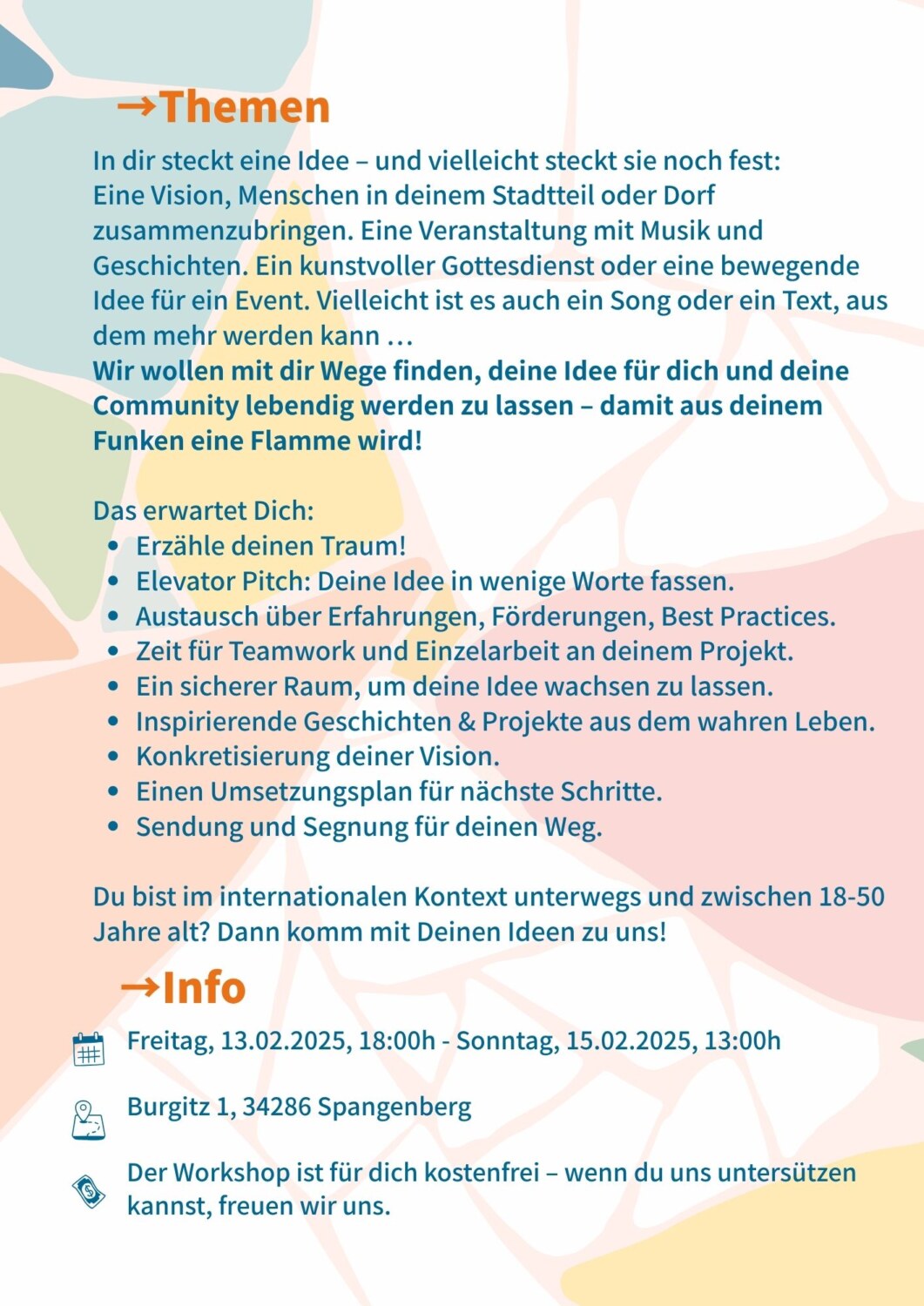 Du hast eine Idee, die schon lange in dir schlummert? Wir wollen dir helfen, sie zum Leben zu erwecken – mit Kreativität, Erfahrung und einem Wochenende voller Austausch, Inspiration und Mut zum nächsten Schritt.